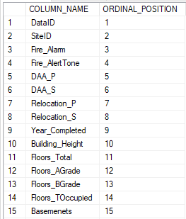 Skipping up to line 15, we designate the cursor column (@cursor_col), or the specific column in the table that we’re working on in each iteration of the loop. We do this by again querying the Information Schema, and ask it to select the column name in our table where the ordinal position is equal to our counter (@loopcount). To give you an idea of what we’re working with, this is what the output looks like if I query all the column names and ordinal positions.