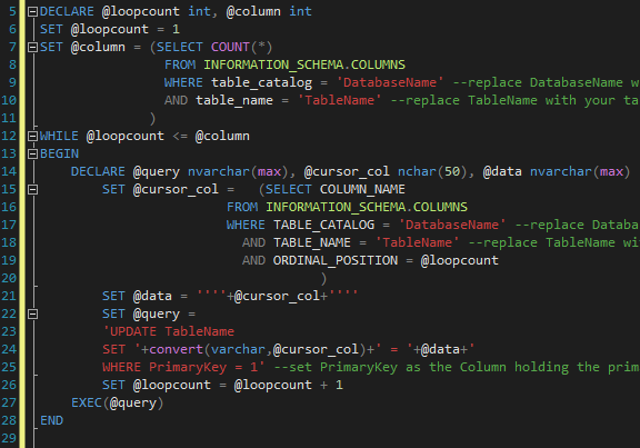 Fourth, you should set @loopcount equal to the ordinal position of the column you want to start on, when I executed this I started on the third column as the first two in my table contain keys.